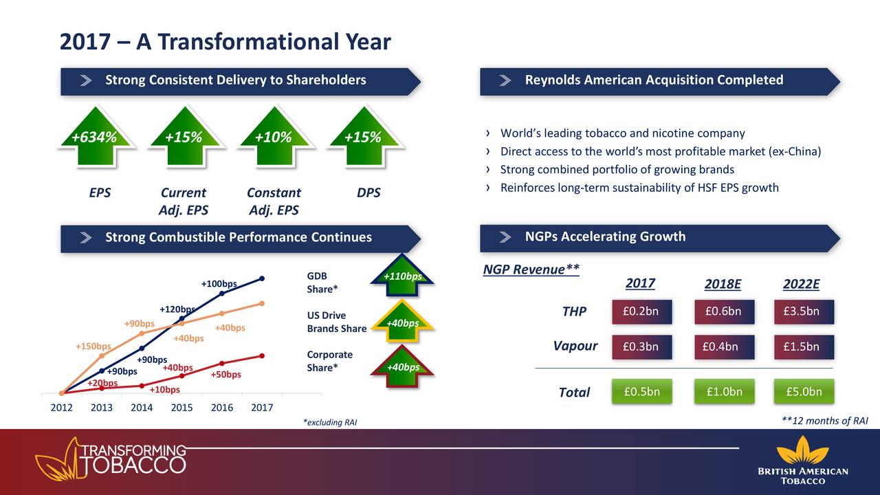 The following slide deck was published by British American Tobacco p.l.c. (American Depository Receipts) in conjunction with their 2017 Q4 earnings call.