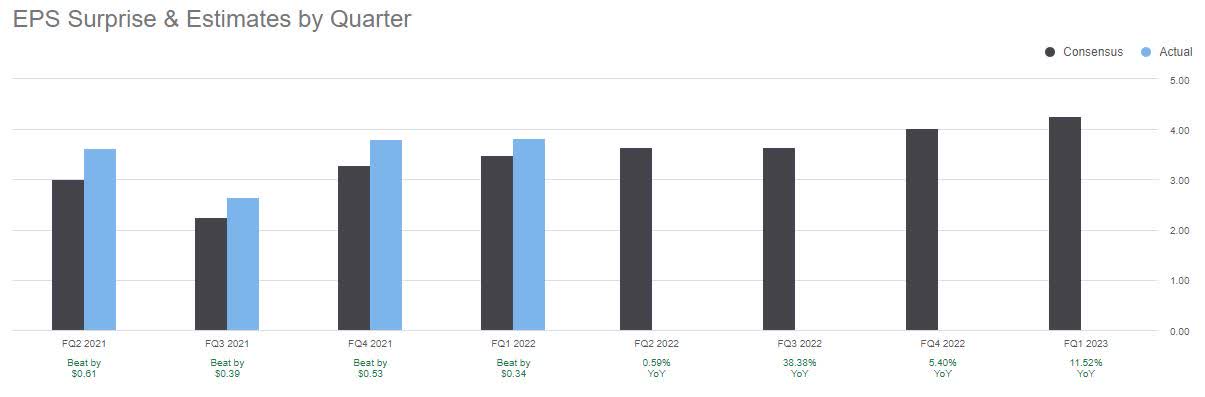 Q1 2022 earnings resulted in an EPS of $3.82, beating by $0.34. Despite a revenue miss, $9.2B in total net premiums were written, a gain from $8.7B from the prior year. Core operating income beat consensus and P&C underwriting income increased from $622M in Q1 2021 to $1.3B in Q1.